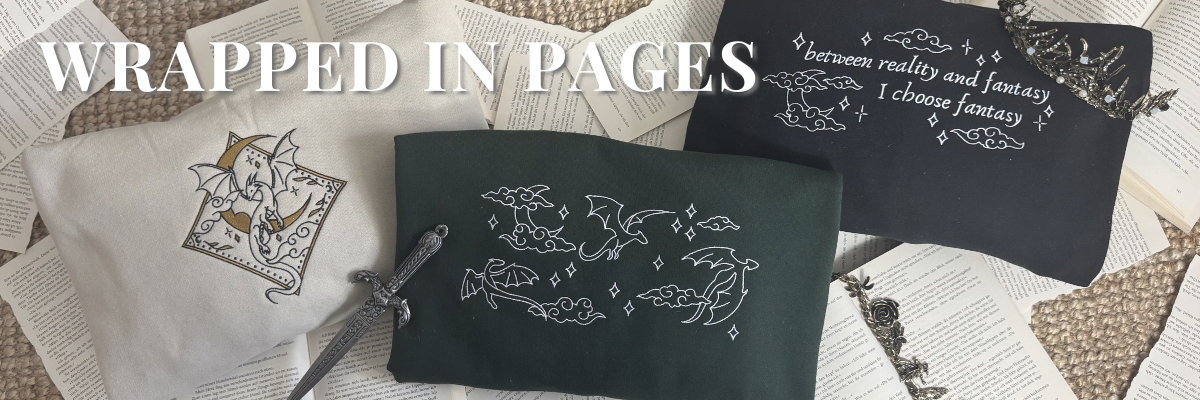 Endlich neuer Fantasy Buch Merch – viele neue handgezeichnete Designs, die es so nur bei Wrapped in Pages gibt.