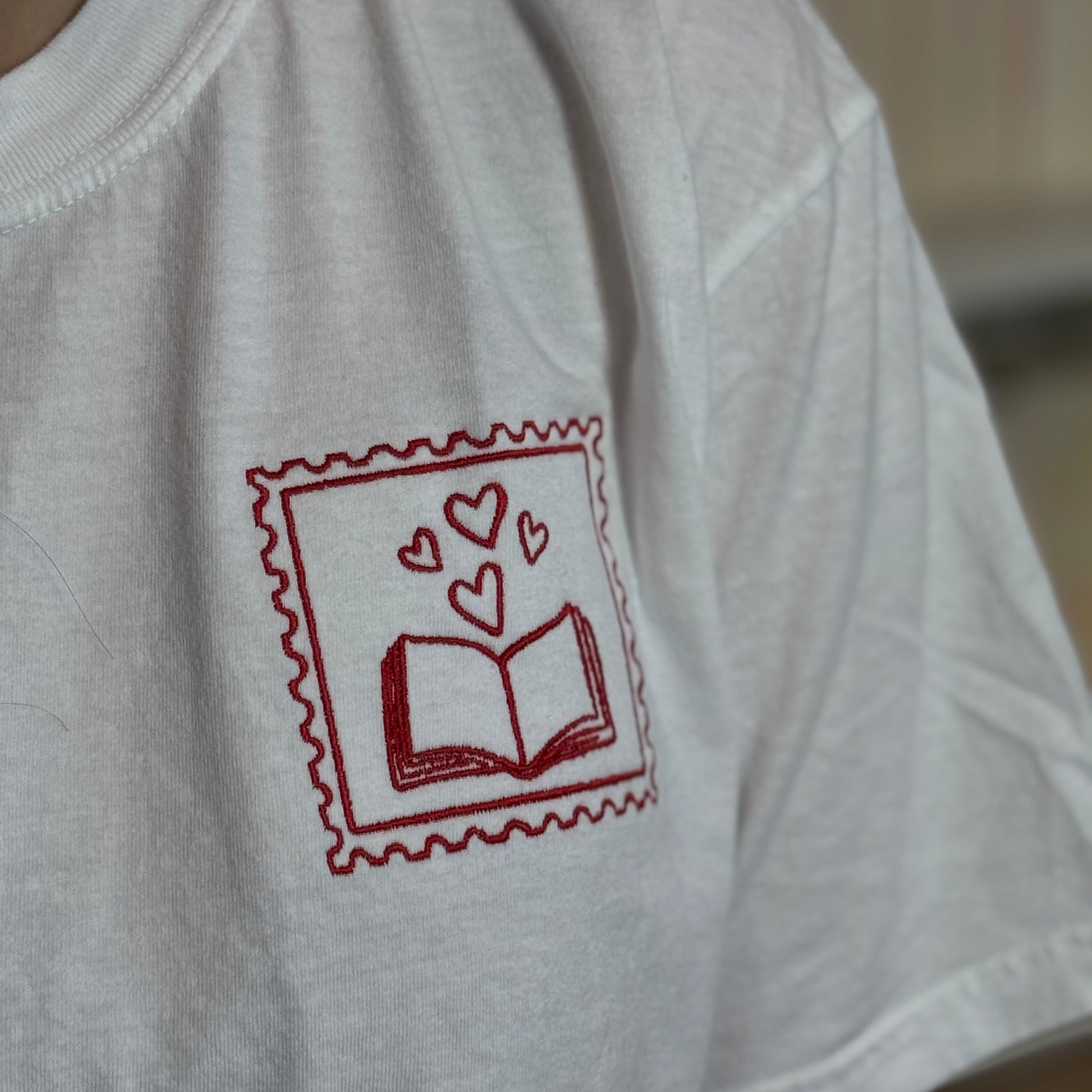 Die feine Stickerei in Form einer Briefmarke mit Buch und Herz macht das Shirt zu einem besonderen Lieblingsstück – perfekt für Lesetage, den Alltag oder den nächsten Buchladen-Bummel.