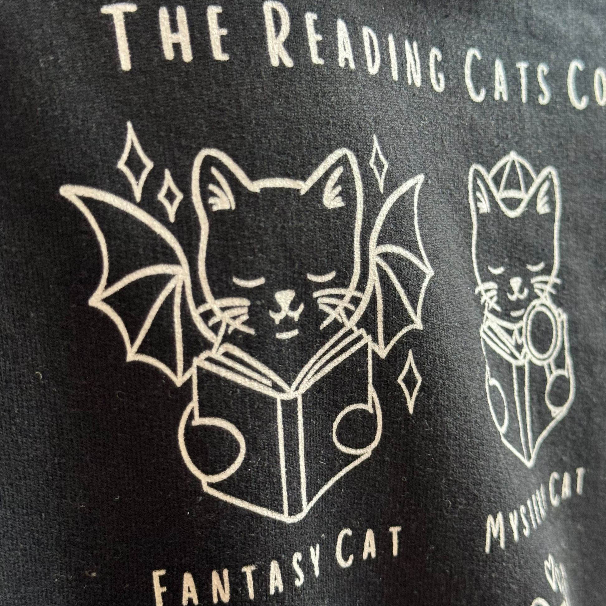 Vorne eine kleine Katze mit Buch als dezenter Frontprint – hinten ein großer Backprint mit neun verschiedenen Katzen, von Fantasy über Romance bis Thriller.